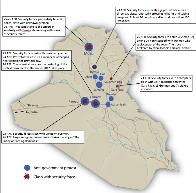 Political efforts to resolve the crisis continue, but with little success thus far. Parliamentary Speaker Osama al-Nujaifi attempted to hold a parliamentary session to discuss the Hawijah incident, but he was forced to downgrade it to a “confidential consultative meeting” due to a lack of quorum. No Members of Parliament (MPs) from Maliki’s State of Law Alliance were present, and there were reports of a verbal altercation between Nujaifi and a Sadrist MP over the Hawijah attack. Nujaifi has called for another parliamentary session tomorrow. It will be difficult for any side to negotiate a political solution to the crisis as long as violent clashes persist.