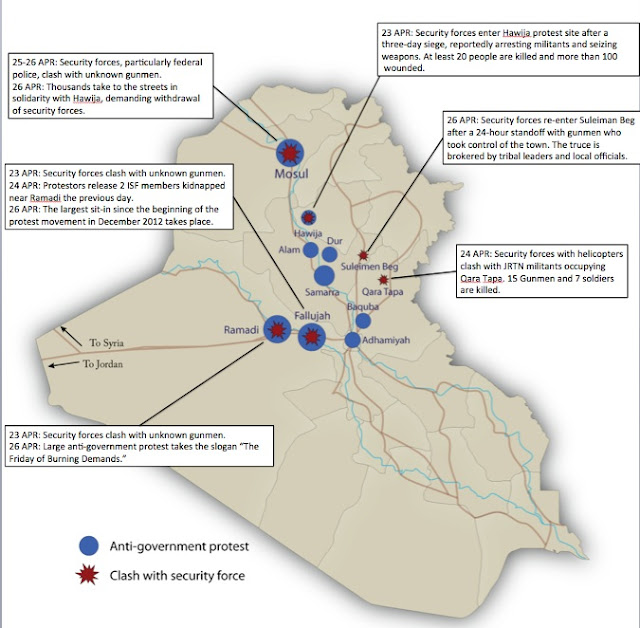 More than 200 people have been killed in five days of clashes following the attack on protesters in Hawijah (click here for a detailed analysis of the incident and its immediate aftermath). The violence continued over the weekend when five Iraqi Army soldiers were killed outside a protest camp in Ramadi. Accounts of the incident vary. Anbar tribal leaders claimed that the soldiers were dressed in plainclothes and had run through two Sunni checkpoints and fired on a third. Government sources blamed Sunni gunmen for instigating the attack.