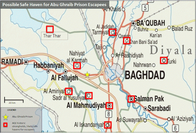 Several events in Karma, including the assassination of a New Sahwa leader and a firefight between armed gunmen and ISF and Sahwa, point particularly to this town as an area where AQI is likely operating again. Likewise, the historic AQI safe haven in the vicinity of Thar Thar provides distance from both hostile Anbari tribes and ISF while offering freedom of movement into the Jazeera and northern Salah ad Din. We will therefore watch these locations for burgeoning AQI operations following this prison break.
